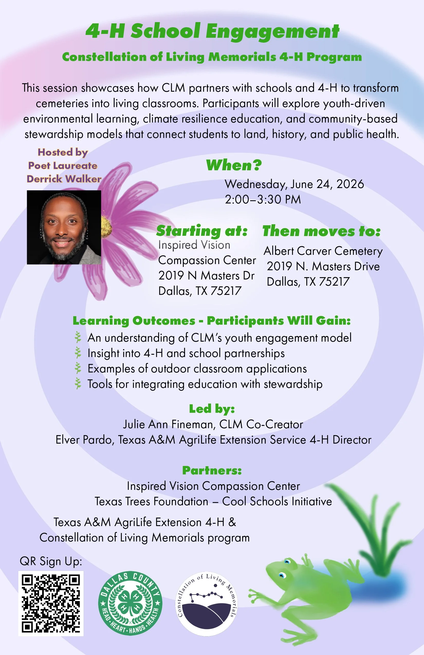 This session showcases how CLM partners with schools and 4-H to transform cemeteries into living classrooms. Participants will explore youth-driven environmental learning, climate resilience education, and community-based stewardship models that connect students to land, history, and public health.